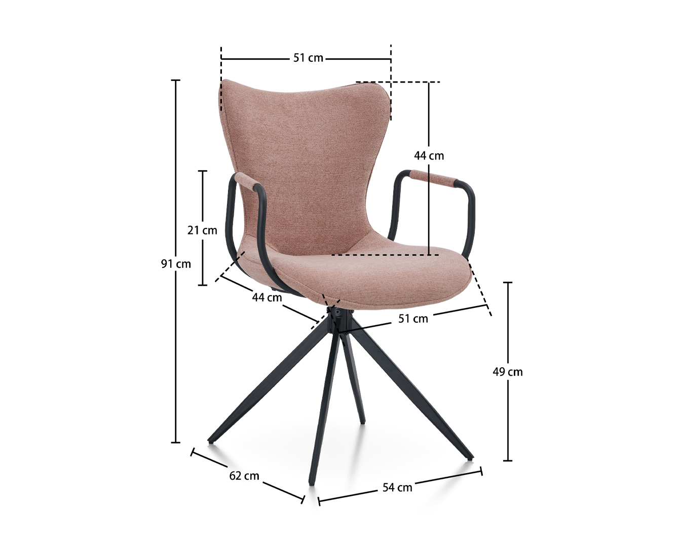 • Zabalený v luxusnej červenej ružovej látke, vyžaruje teplú a príjemnú atmosféru. Dizajn stoličky je premyslene vytvorený tak, aby poskytoval optimálnu podporu a pohodlie, vďaka čomu je vhodný pre každodenné použitie aj pre špeciálne príležitosti.
