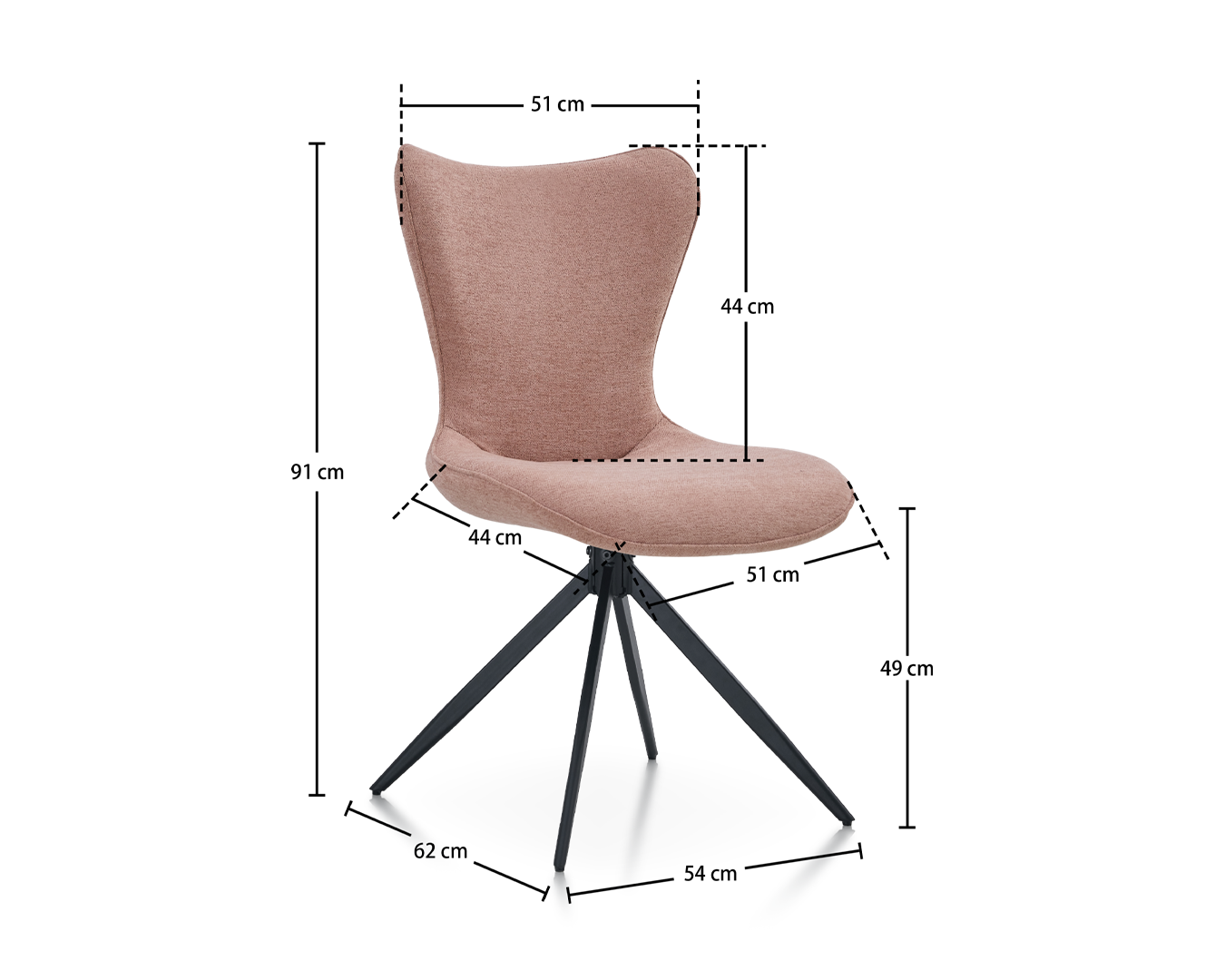 • Čalúnená v mäkkej, červenavej ružovej látke ponúka útulný zážitok z sedenia a zároveň dodáva do každého jedálenského priestoru nádych sofistikovanosti. Elegantný dizajn stoličky je doplnený jeho robustnou základňou čierneho kovu, ktorá nielen poskytuje stabilitu, ale tiež vylepšuje jeho súčasnú príťažlivosť.