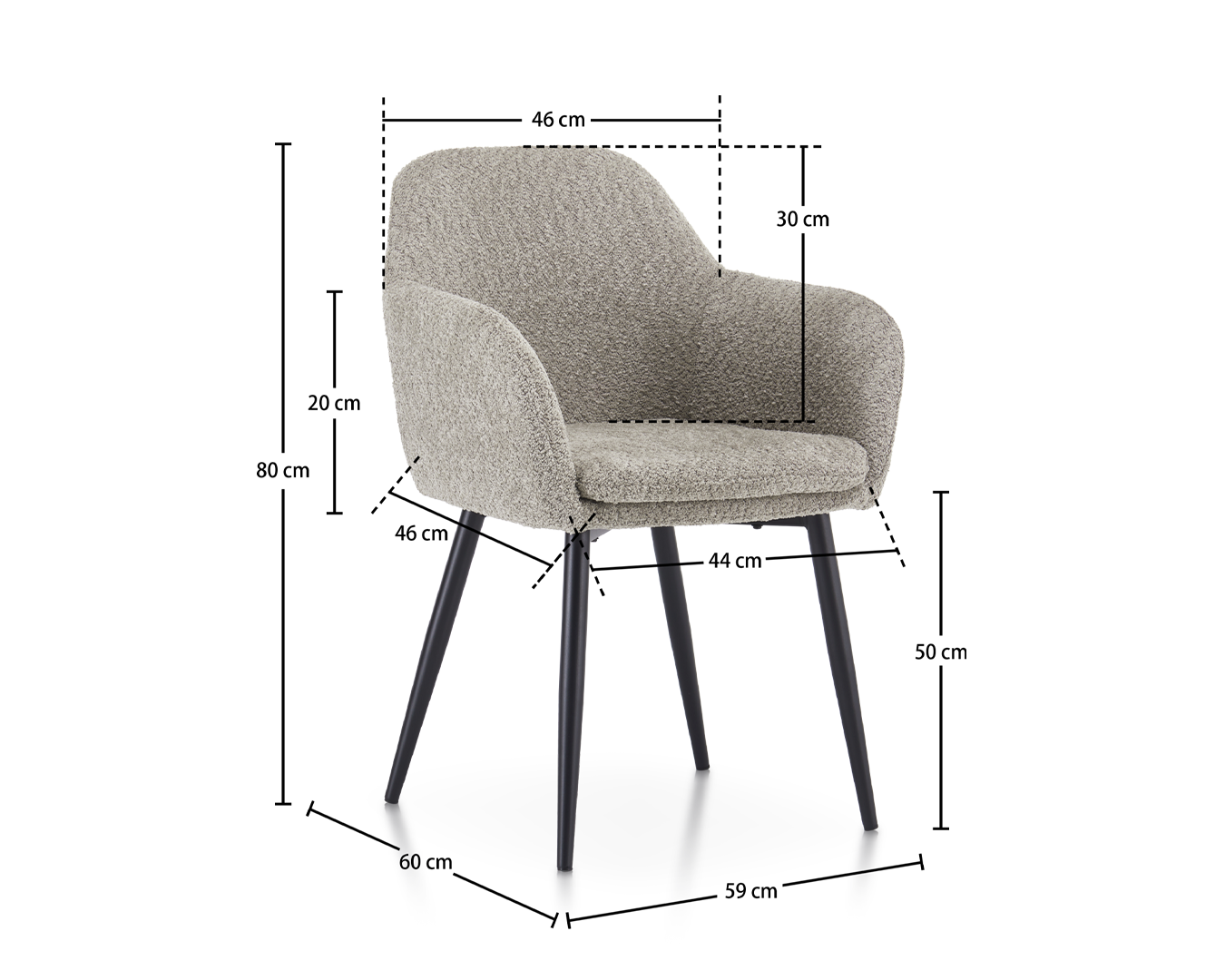 • Ergonomický dizajn zaisťuje optimálnu podporu, vďaka čomu je ideálny pre dlhé večere alebo neformálne jedlá, zatiaľ čo elegantné čierne kovové nohy dodávajú dotyk sofistikovanosti a stability a plynulo sa miešajú s akýmkoľvek dekorom.