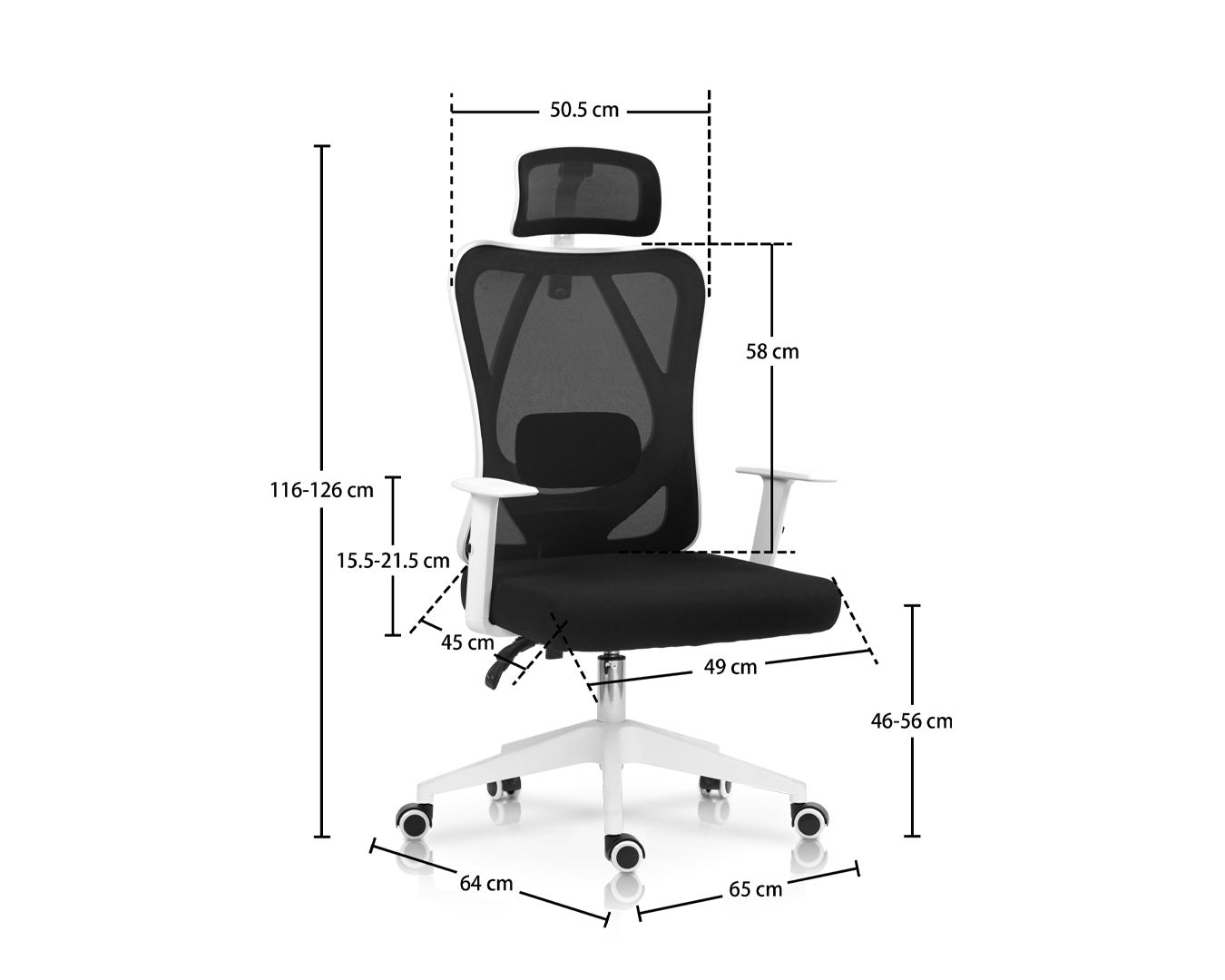 • Mechanizmus nastaviteľnej výšky vám umožňuje prispôsobiť stoličku tak, aby vyhovoval vašim špecifickým potrebám, a zaisťuje, že vaše chodidlá sú ploché na zemi a vaše kolená sú v uhle 90 stupňov. Lakelá na lakkanie je možné upraviť tak, aby poskytla perfektnú oporu pre vaše ruky, čím sa znížilo napätie na pleciach a krku. Bedrová podpora zabudovaná do operadla podporuje správne držanie tela a zvyšuje celkové pohodlie a produktivitu.