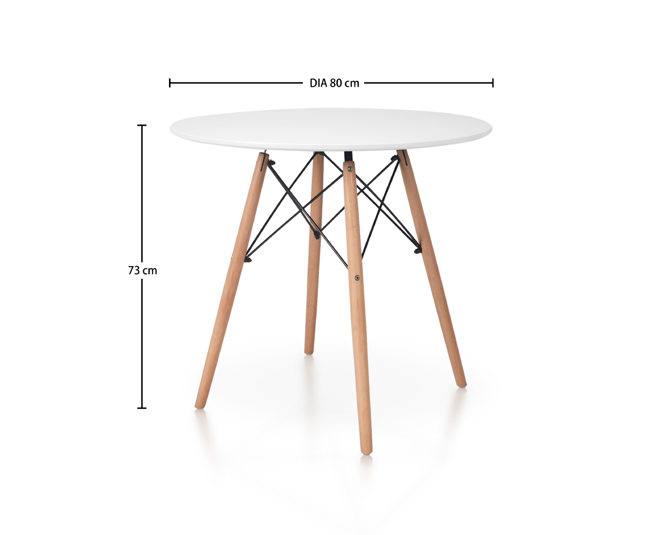 • Okrúhly vrchol stola, vyrobený z dosky prémiovej hustoty, sa môže pochváliť nedotknutým bielym povrchom, ktorý vyžaruje sofistikovanosť a jednoduchosť. Prírodné drevené nohy poskytujú teplý kontrast k bielej stolovej doske a vytvárajú vyvážený a harmonický vzhľad. Rám čierneho drôtu, ktorý spája nohy, dodáva silu aj modernú estetiku, vďaka čomu je tento stôl v každej miestnosti vynikajúci kus.